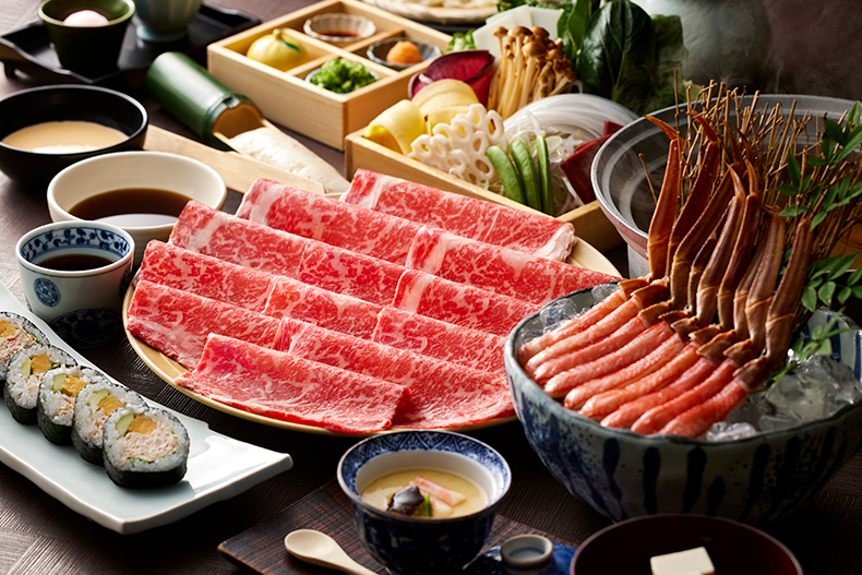 名物のしゃぶしゃぶ・かにをはじめ、旬の魚介や野菜など地物の食材をふんだんに使った、職人こだわりのお料理をお楽しみください。